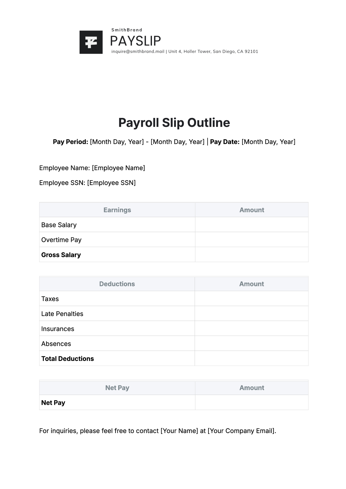 First, start by including your personal details such as your name, address, and contact information at the top of the salary slip. This will ensure that the document is personalized and easy to identify as yours.