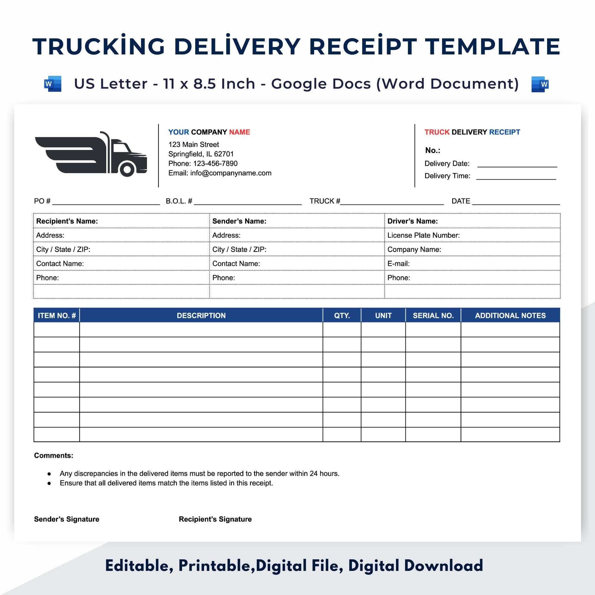 Trucking Delivery Receipt Google Docs word Document Etsy