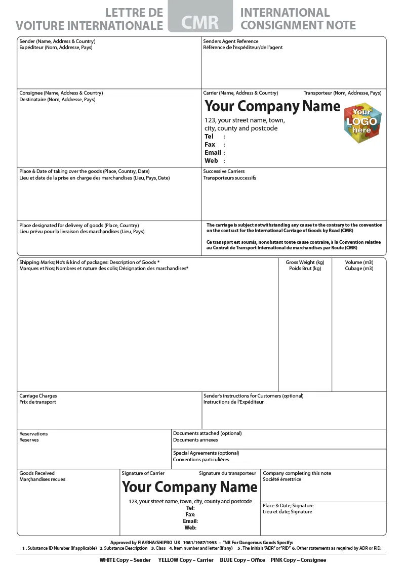 CMR DELIVERY NOTE Template For NCR Printing From 84