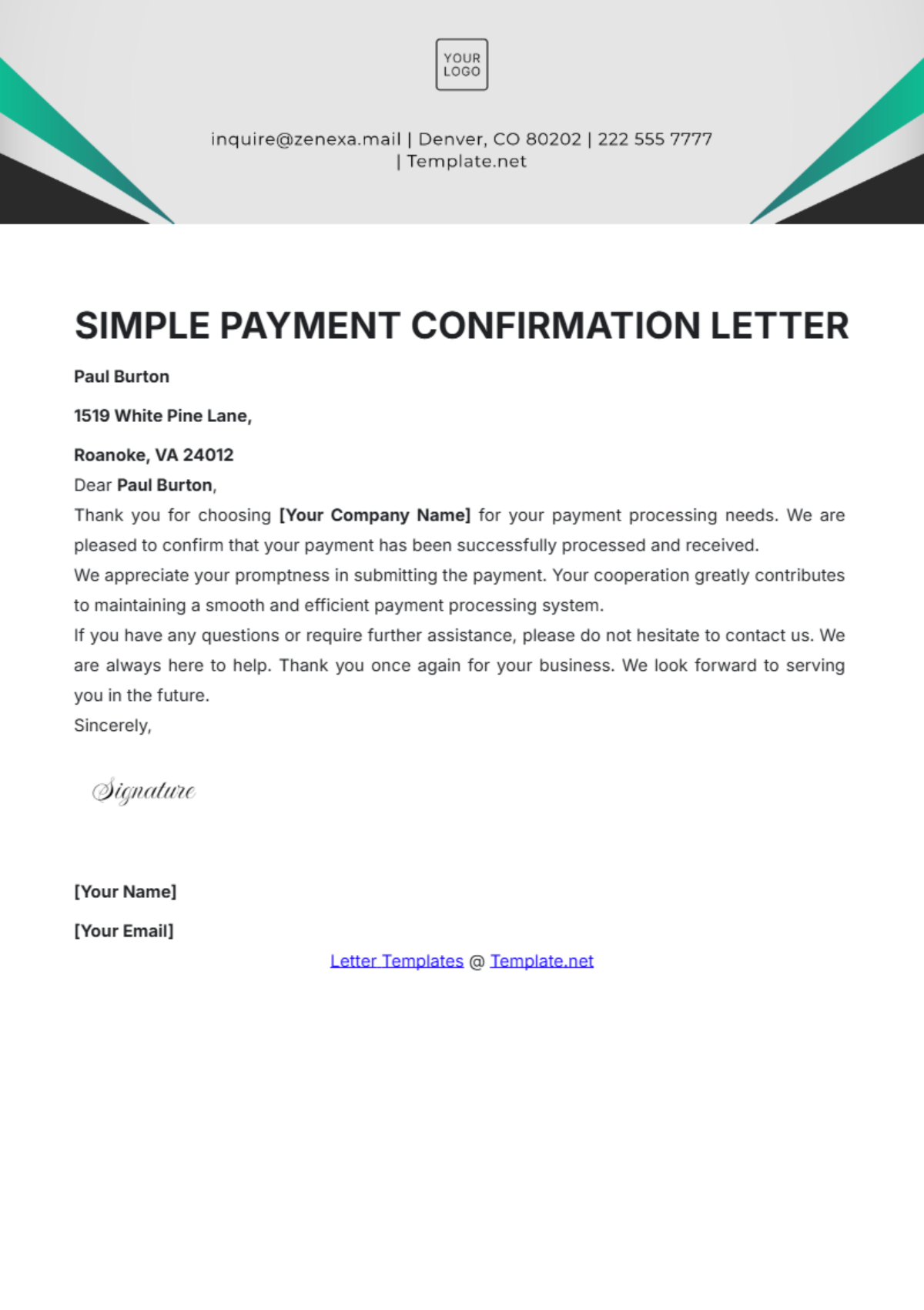 Confirmation Of Payment Letter Free Template