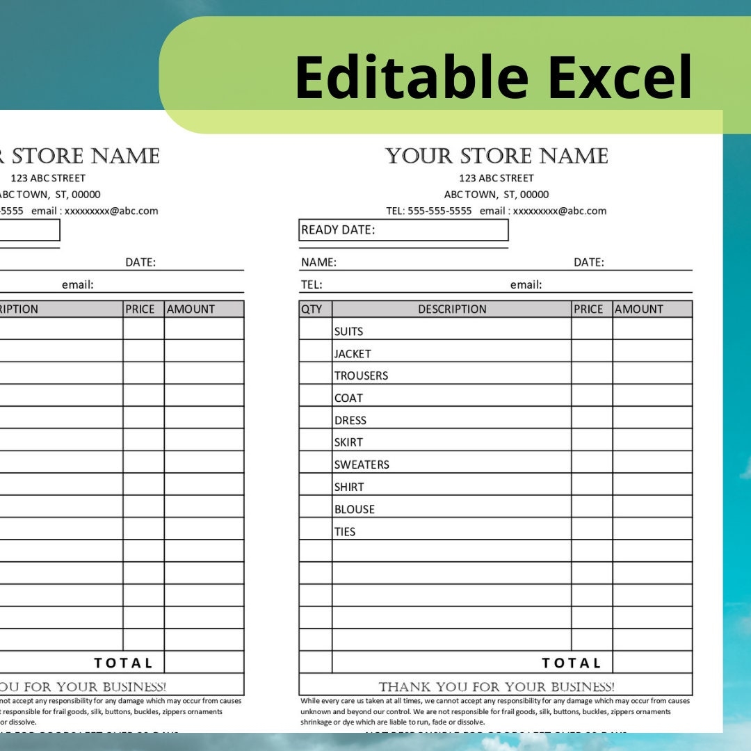 Dry Cleaner Receipt Template Editable Dry Cleaning Invoice Digital Download Excel Format Dry Cleaning Valet Laundry Etsy