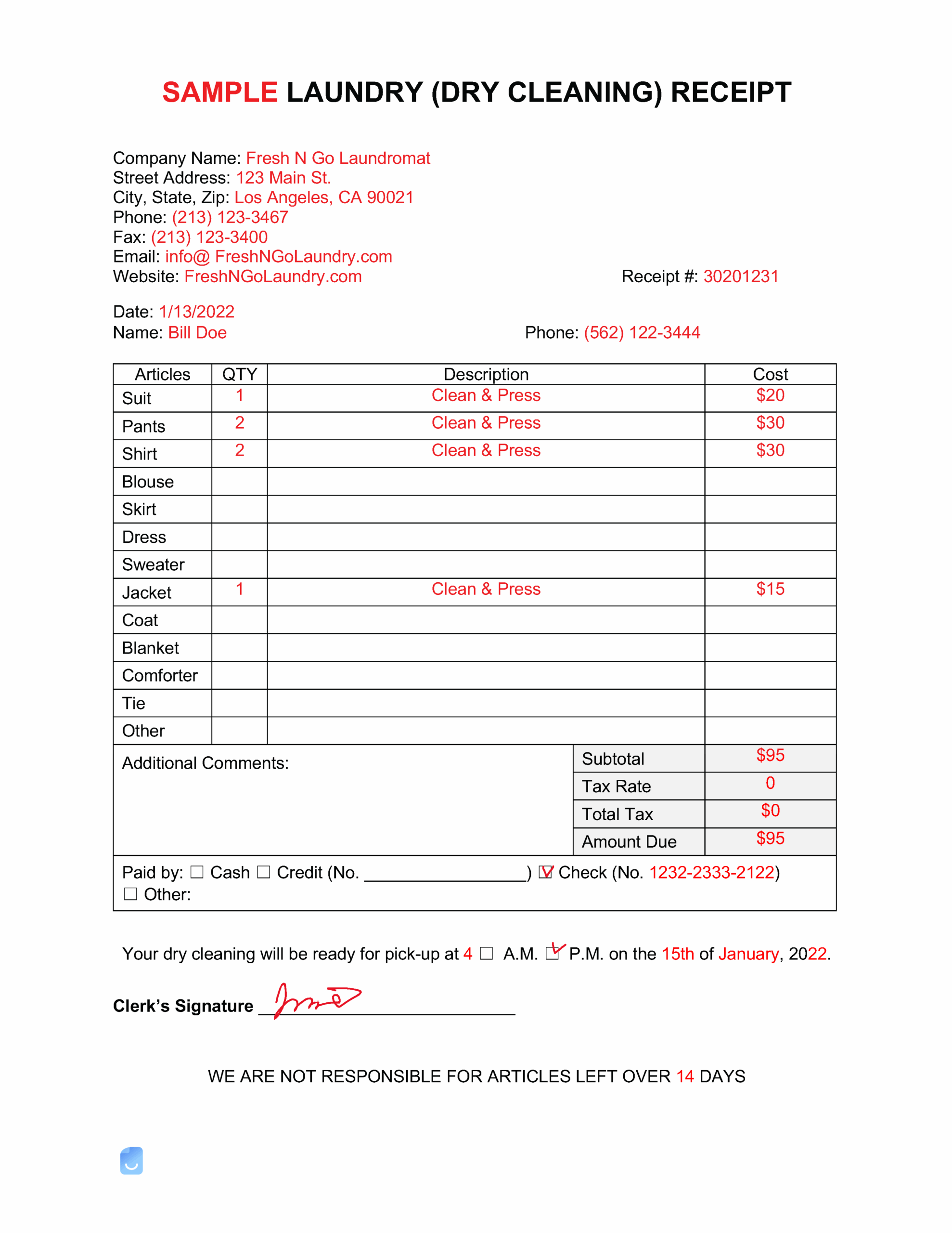 Free Dry Cleaning Receipt Template PDF Word EForms