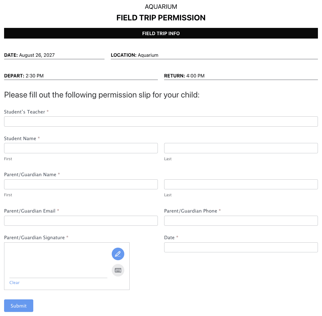 Having all the necessary information in one place not only makes it easier for parents or students to provide consent but also ensures that you have everything you need to organize a successful event or trip. No more chasing down missing permission slips or contact information!
