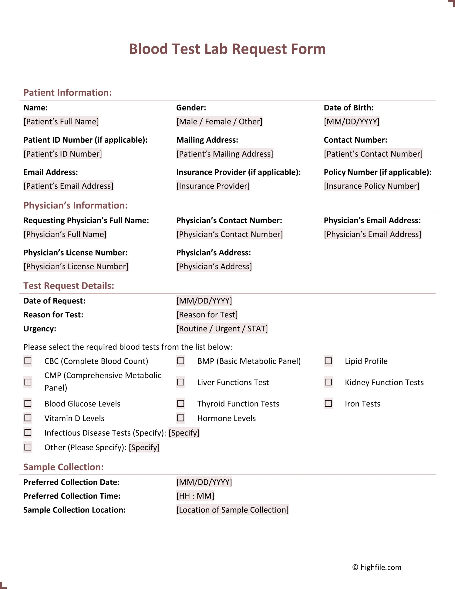 Blood Test Lab Request Form Word PDF Google Docs Highfile