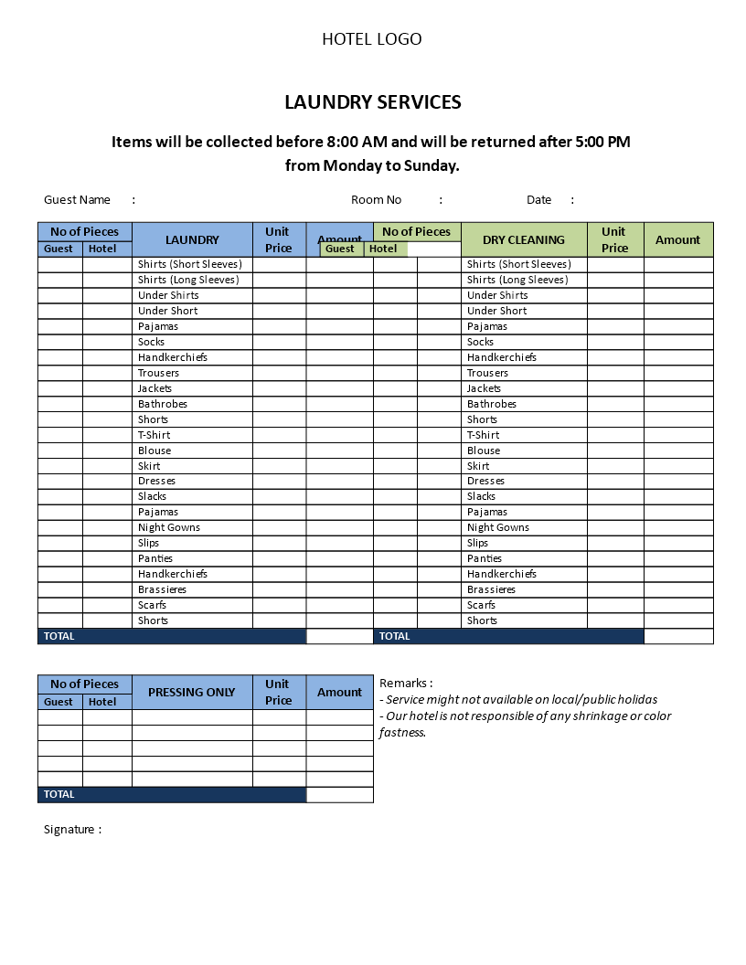 Free Hotel Laundry Service Checklist Template To Edit Online