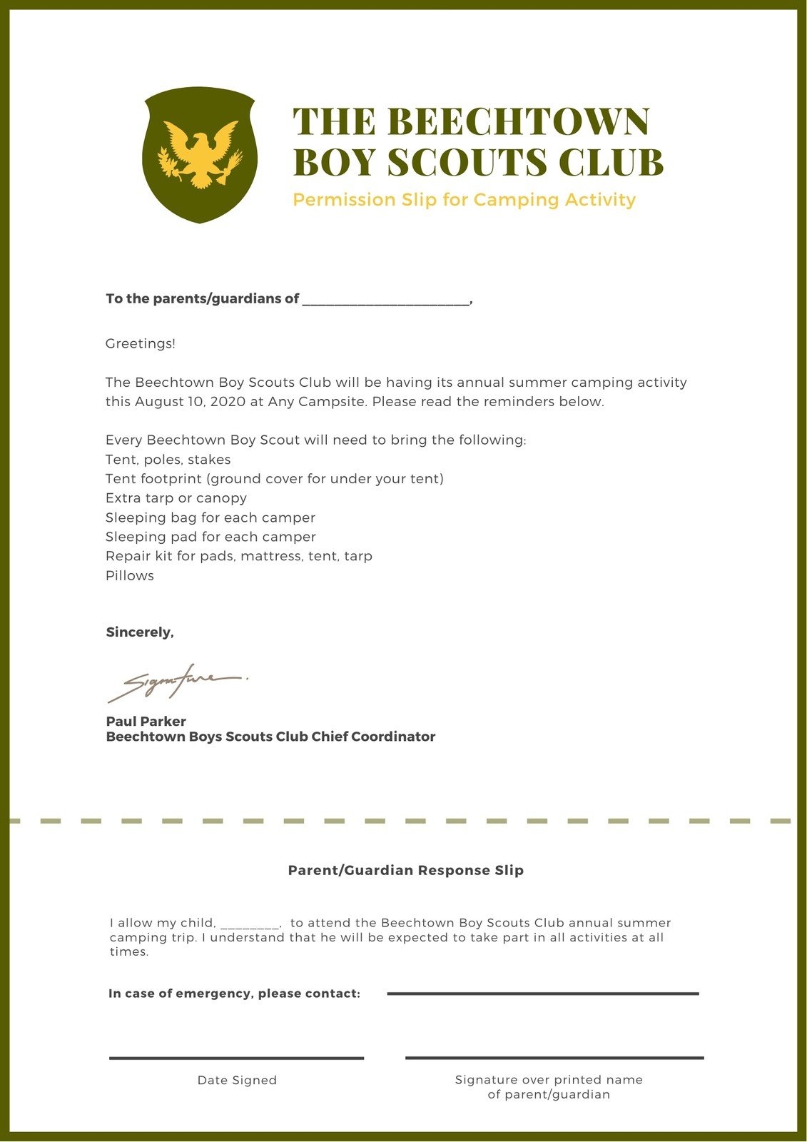 Planning a camp trip for your kids? Make sure you have all the necessary paperwork in order, including a permission slip. Our free Permission Slip Template Camp is here to make your life easier!
