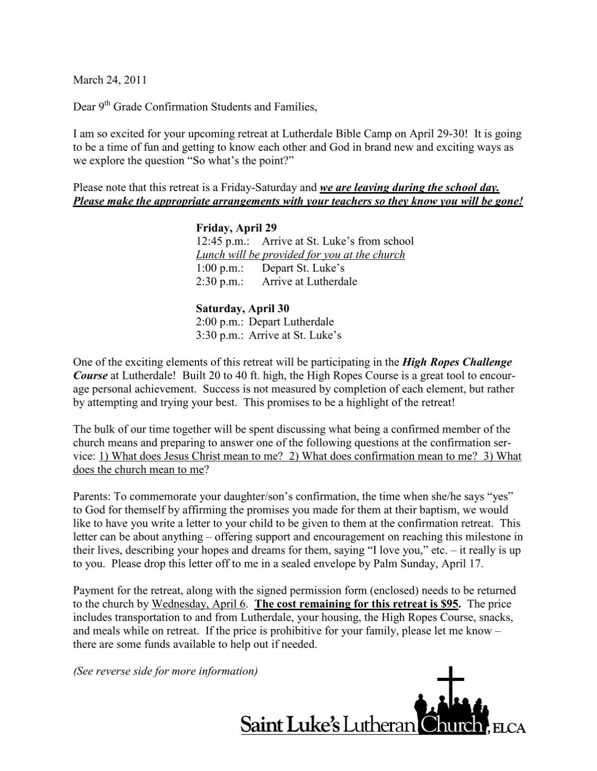 9th Grade Retreat Letter U0026 Permission Form St Luke s Lutheran
