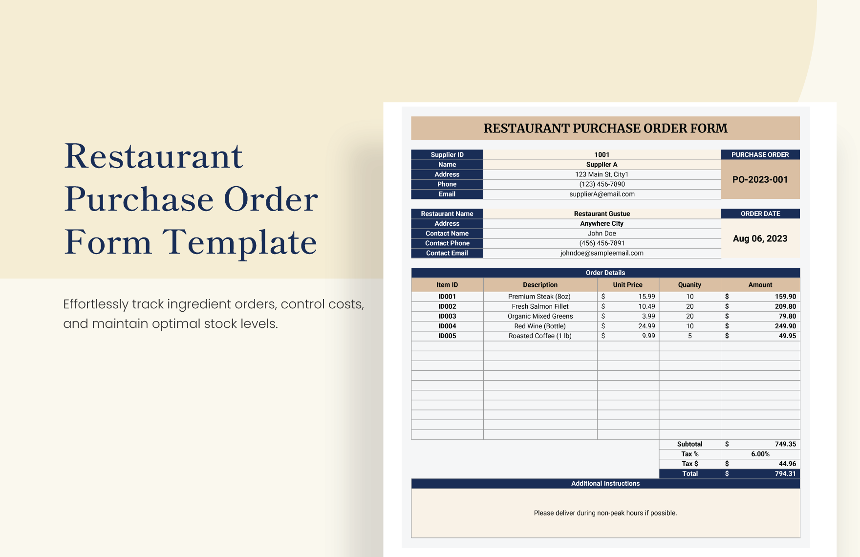 Restaurant Purchase Order Form Template In Excel Google Sheets