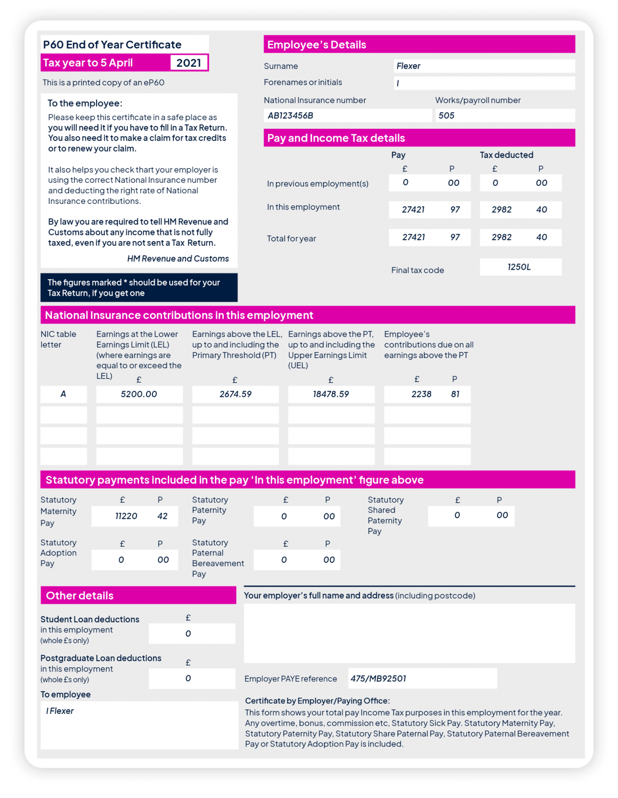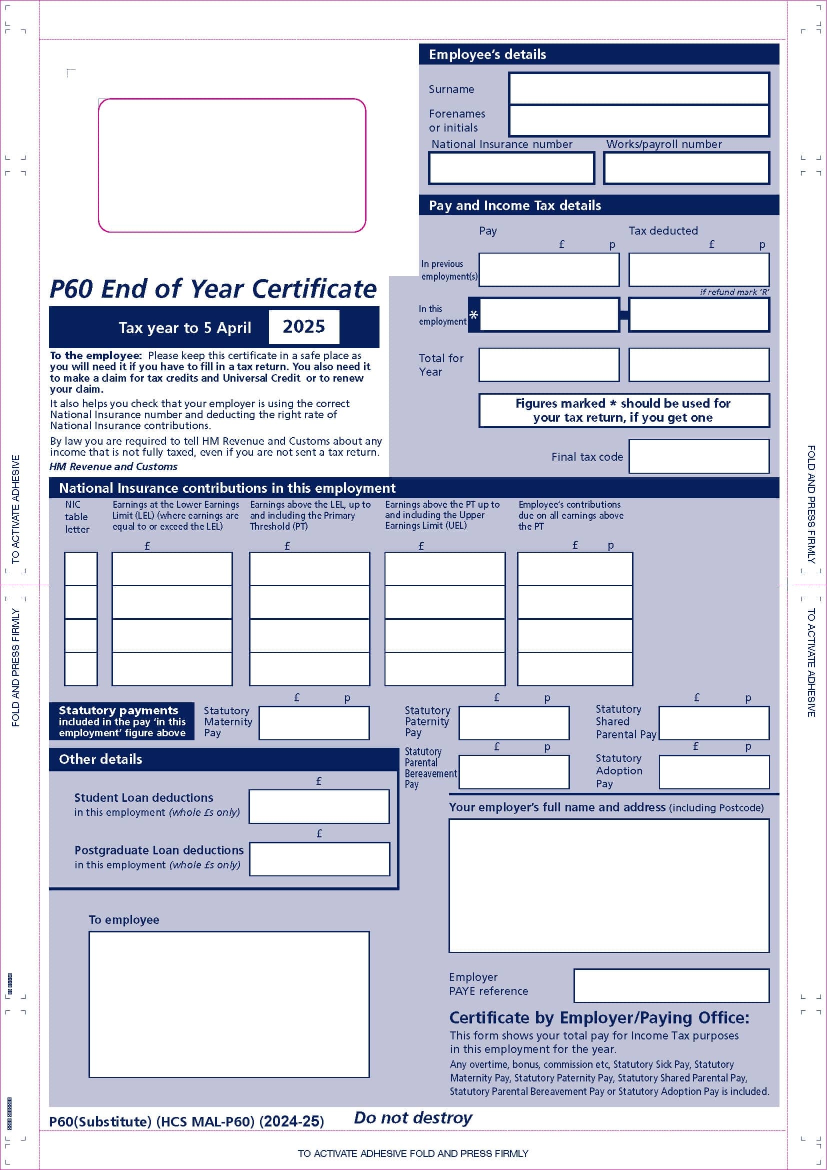 2025 P60 Year End Form MALP60 PEGASUS SELF SEAL P60