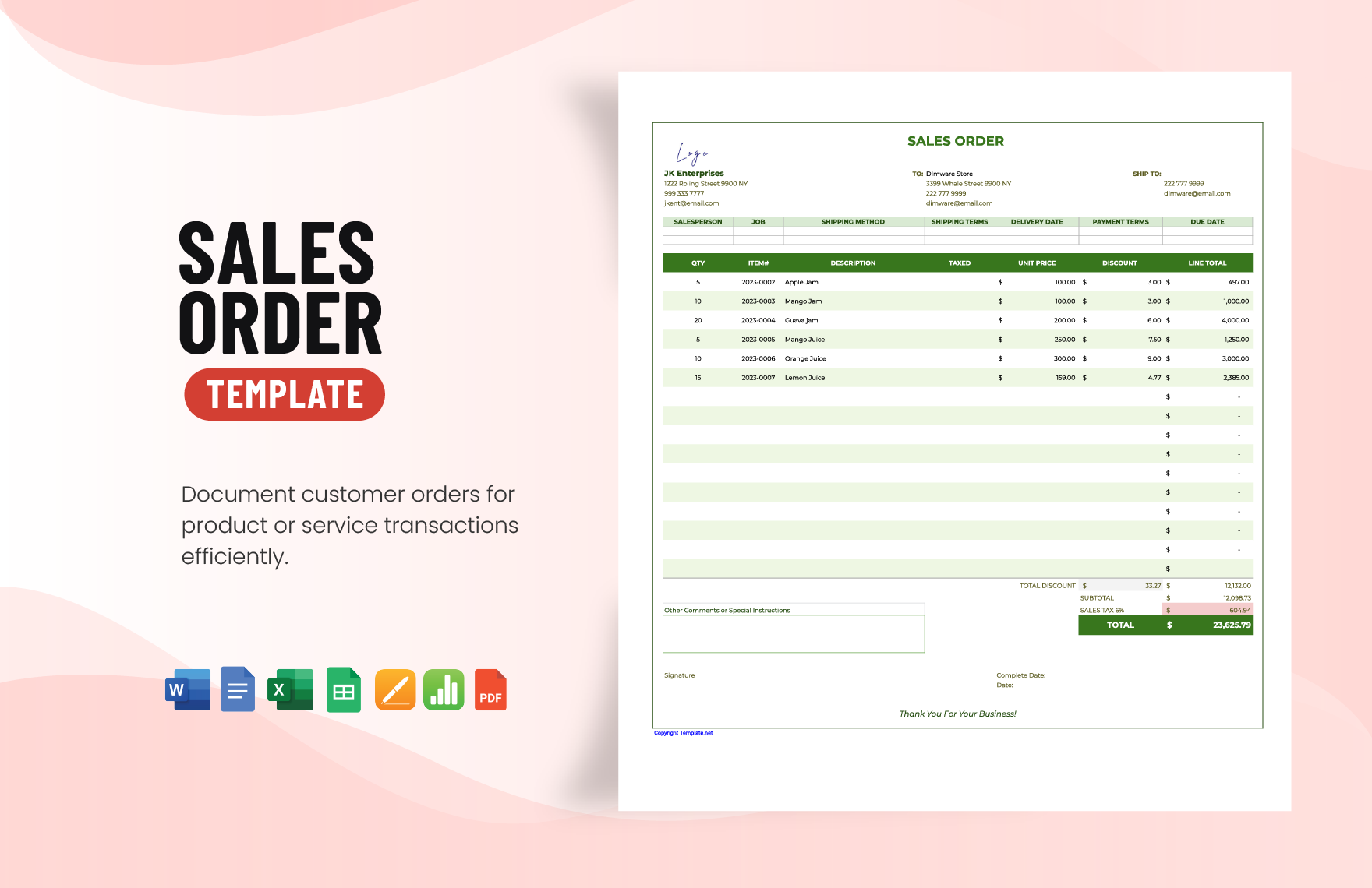Sales Order Template In Word Apple Pages PDF Google Docs Excel Google Sheets Apple Numbers Download Template