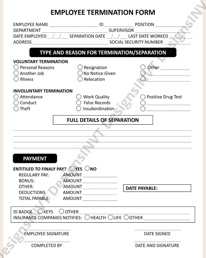 Employee Termination Form Printable Employee Termination Form Editable Employee Termination Form Business Tools Procedure For Employees Etsy