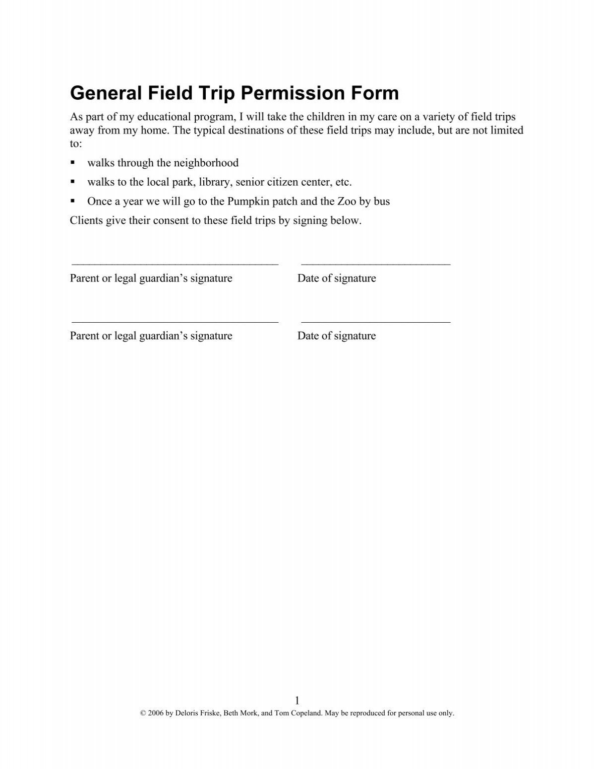 General Field Trip Permission Form Elaines Day Care
